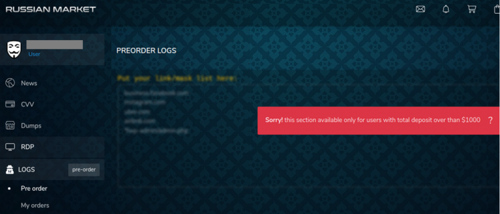 En su diseño y comercialización, estas plataformas se inspiran en servicios legítimos de información y comercio electrónico. Muchos mercados y foros cobran una cuota de suscripción para acceder a la plataforma y luego tienen diferentes estructuras de precios para los datos en función de lo valiosos que puedan ser. En la actualidad, Russian Market dispone de tanto pillaje que cobra una tarifa plana baja, normalmente no superior a 10 dólares, por cualquier subconjunto de datos que los usuarios quieran descargar.